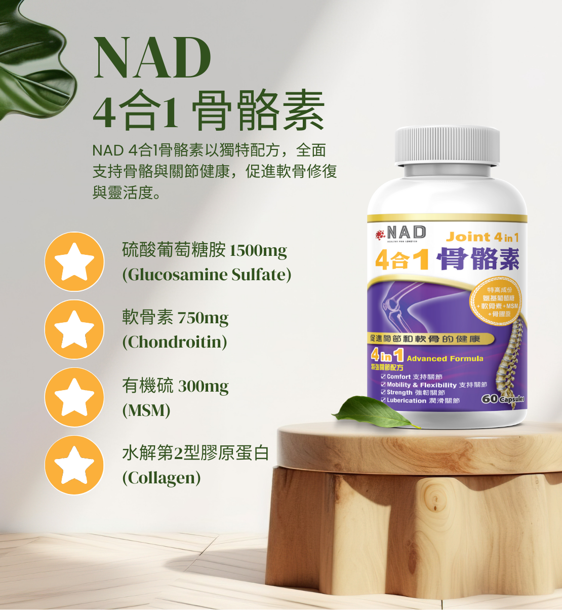 NAD 4合1骨骼素以獨特配方,全面支持骨骼與關節健康,促進軟骨修復與靈活度。