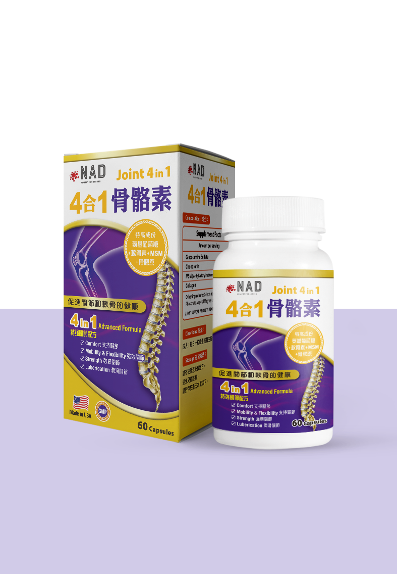 NAD 4合1骨骼素以獨特配方,全面支持骨骼與關節健康,促進軟骨修復與靈活度。